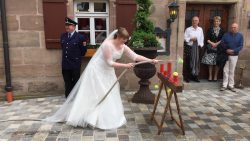 Bevor das Brautpaar die zahlreichen Glückwünsche der Hochzeitsgesellschaft und der Feuerwehrkameraden entgegen nehmen konnte musste allerdings noch gezeigt werden, wie man richtig mit einem Feuerwehrschlauch umgeht. Severin pumpte mit der Kübelspritze wie eine waschechter Maschinist und Judith spritzte die aufgestellten Ziele um.