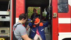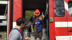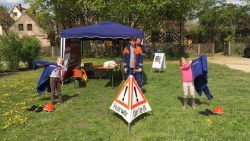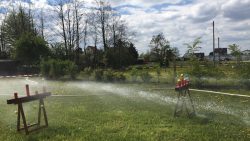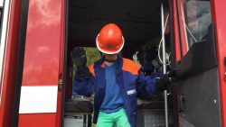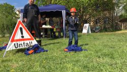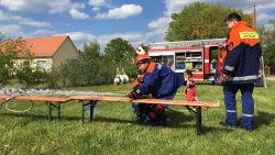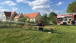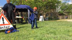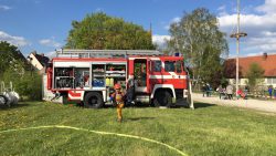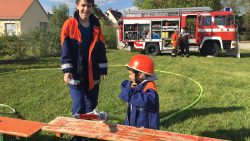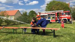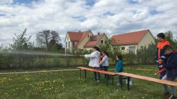 Die Kinder mussten bei dem Parcours zunächst Einsatzkleidung anziehen und danach um die Verkehrsleitkegel einen Slalom laufen. Anschließend ging es durch das LF hindurch und auf der anderen Seite mussten dann mit dem Strahlrohr Bälle von einem Ständer gespritzt werden.