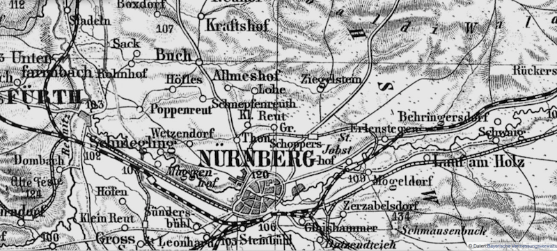 Ein Schadenfeuer war damals ein wirklich großes Unglück, denn allzu leicht konnte es sich zu einer Katastrophe ausweiten. Eng waren auch in Almoshof die in sich geschlossenen Bauernhöfe aneinandergebaut. Eine Unmenge überdimensionaler Holzbalken, die einem Feuer mächtig Nahrung gaben, trugen die hohen Dächer. Wasser stand nicht in ausreichender Menge zur Verfügung. Die offenen Lichter, mit denen damals noch in Haus und Hof hantiert werden musste – die elektrische Beleuchtung kam erst um die Jahrhundertwende -, bildeten eine stete Feuergefahr und verzweifelt, völlig mittellos und auf sich allein gestellt standen die bedauernswerten Geschädigten oft vor den rauchenden Trümmern. Dazu waren die allgemein gebräuchlichen Feuerlöschgeräte noch äußerst primitiv und wenig wirksam. Die für die damalige Zeit modernen Druckspritzen aber, für die das Wasser noch zugefahren und eingefüllt werden musste, waren sehr teuer und deshalb auch recht dünn gesät. Mit diesen Spritzen wurden damals durch die Bezirksämter bevorzugt nur die Kirchengemeinden im Knoblauchsland, also die Gemeinden Poppenreuth, Großgründlach und Kraftshof ausgestattet, wo sich, ebenso bevorzugt, auch die Volksschulen unseres Gebietes befanden. Von dort aus sollten sie im Bedarfsfall auch in den eingepfarrten Dörfern zum Einsatz kommen. Wenn man bedenkt, dass bei einem Brand in Almoshof oder Buch die Wehr aus Kraftshof erst alarmiert werden musste, kann man sich vorstellen, dass ein schneller Einsatz, auf den es entscheidend ankam, unmöglich war.